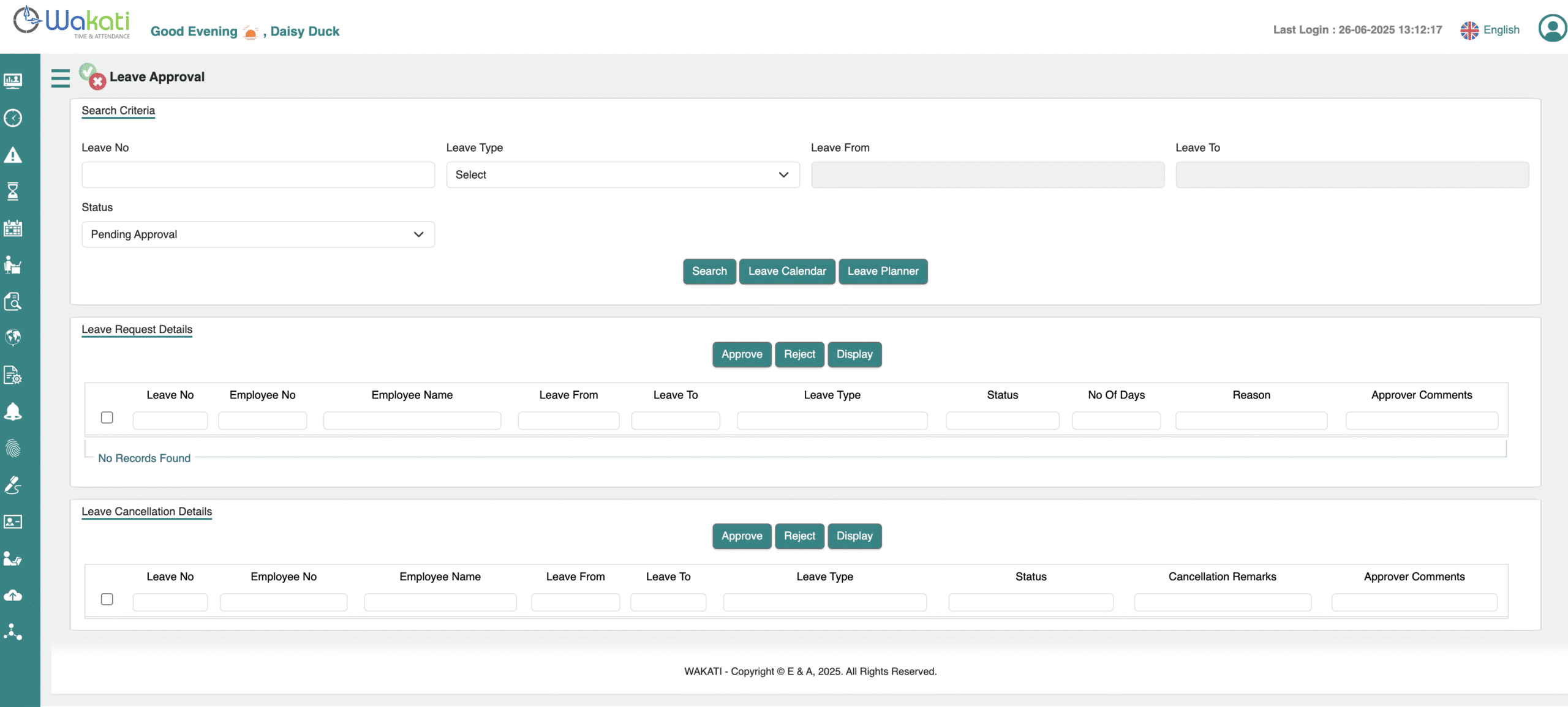 The Leave Request screen provides employees with details about the leave requests made for a selected period. Employees can cancel any requests that are either raised or approved, with both the creation and cancellation processes following the approval hierarchy.